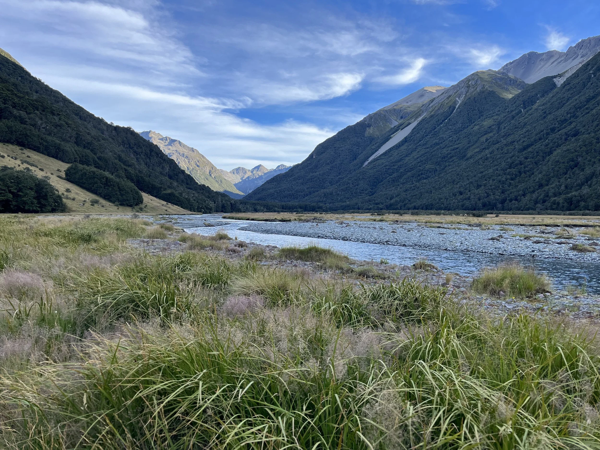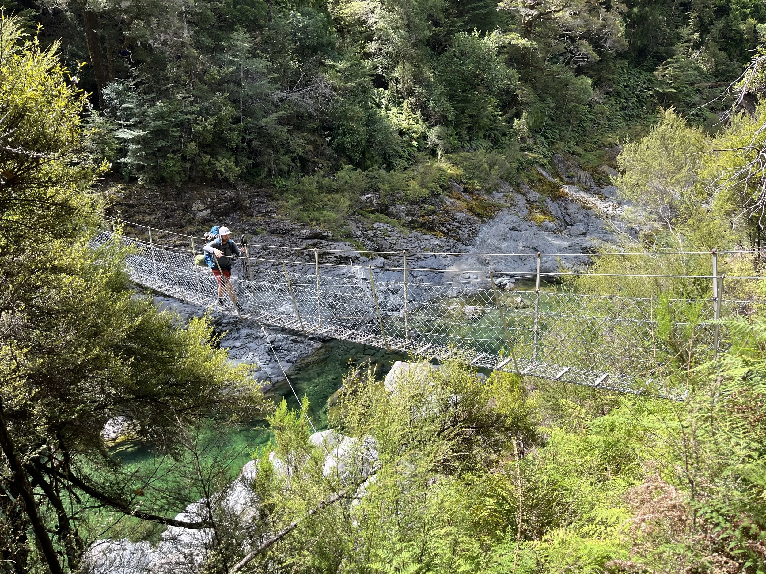 The drive was about 15 minutes, and then we were at the other end of the St James Walkway. Now this was a trail. Beautifully maintained, wide, switchbacks for the steep bits, bridges over the rivers, and even boardwalks for the swampy parts. We really enjoyed the walking, but eventually the fact that we had been going for nearly ten hours caught up with us and we both started getting pretty tired. But a couple breaks, snacks, and some fresh water from a mountain stream helped us make it to Cannibal Gorge hut where we’re sleeping tonight. It’s a bit of a contrast to last night’s hut, as it has 20 bunks! But we again have the whole place to ourselves. We had a great evening with another dip in the river before dinner and bed. As we headed to bed it started raining so it’s shaping up be a cozy night after another challenging day on the trail.